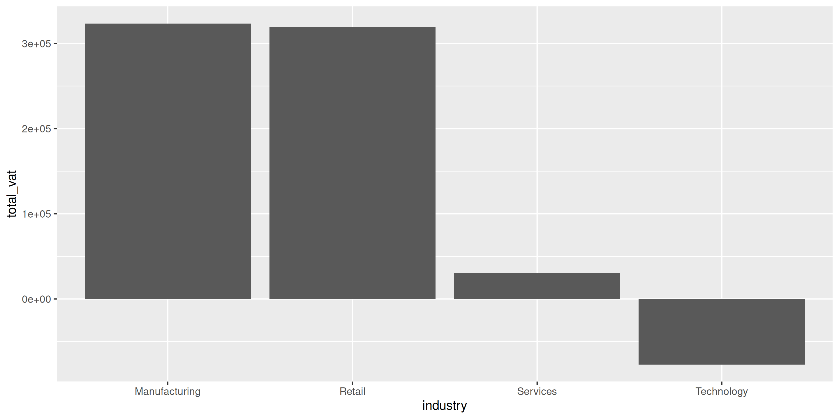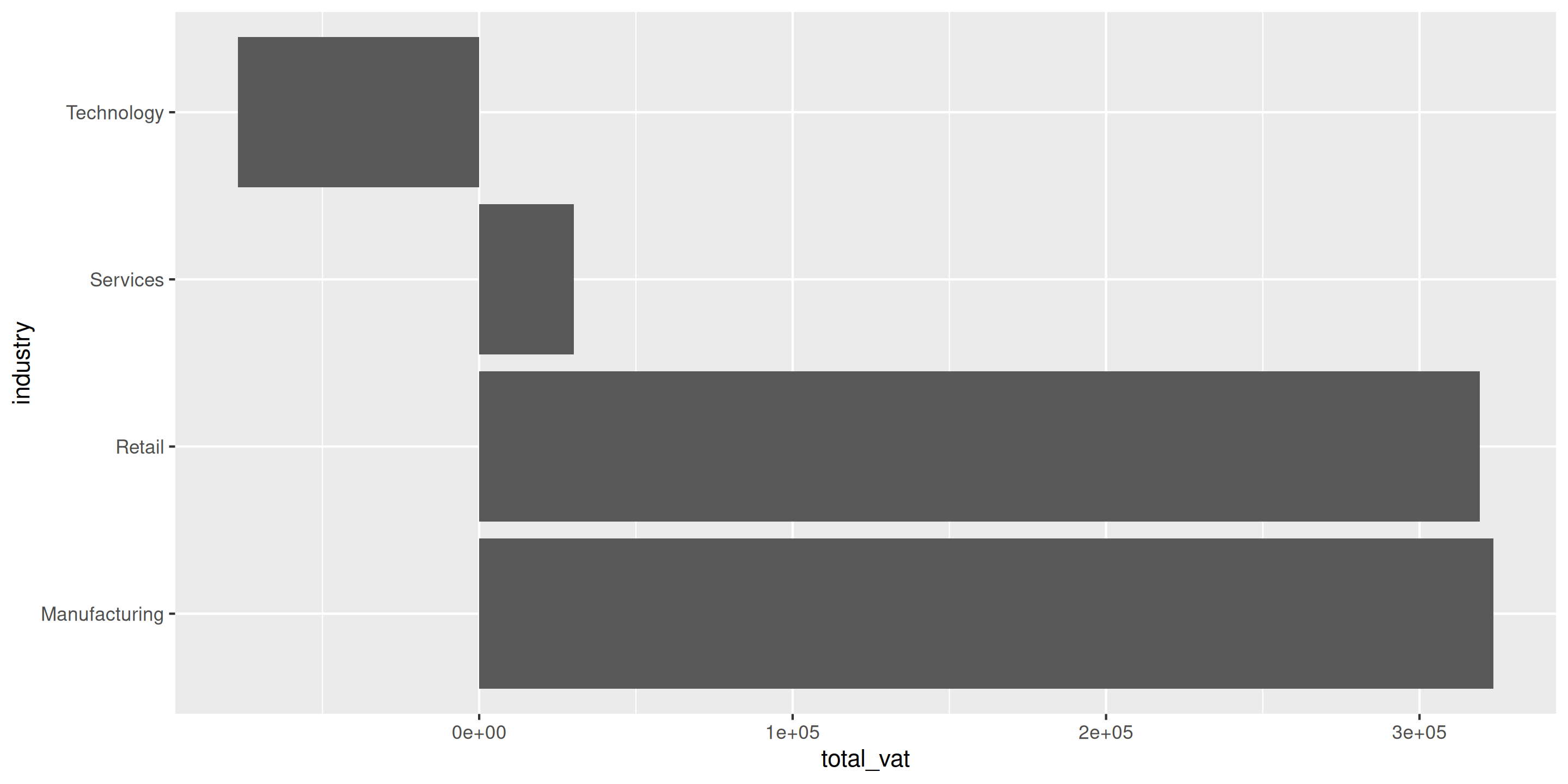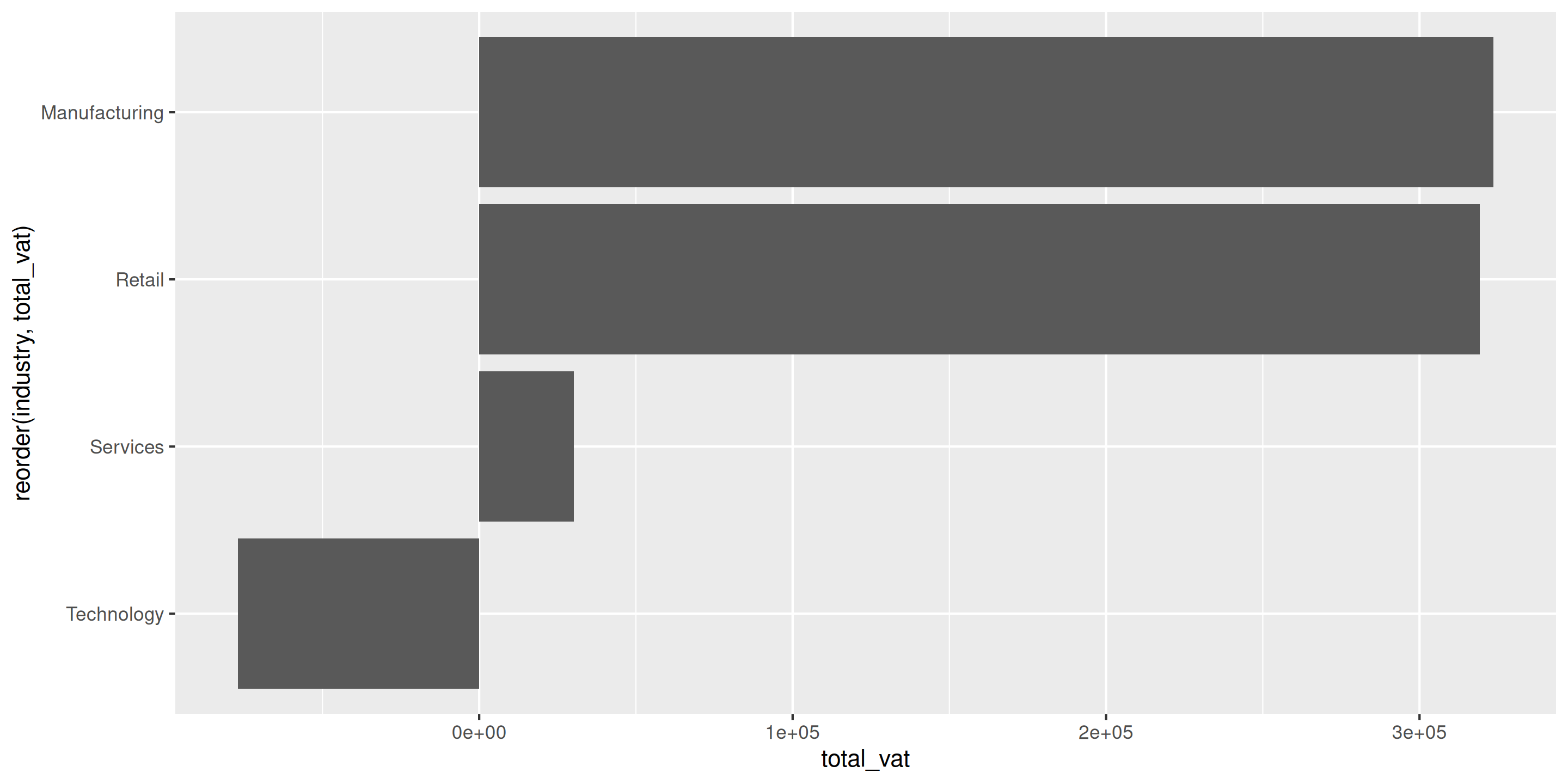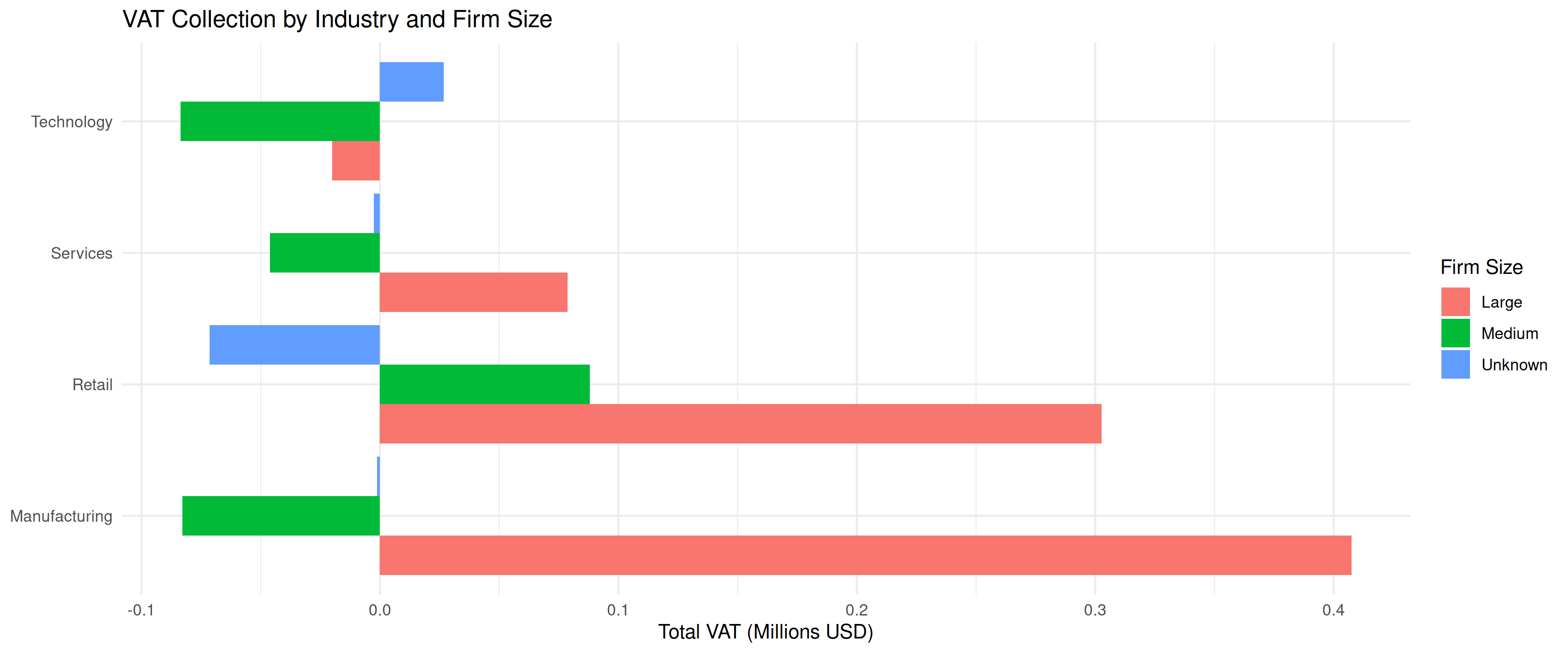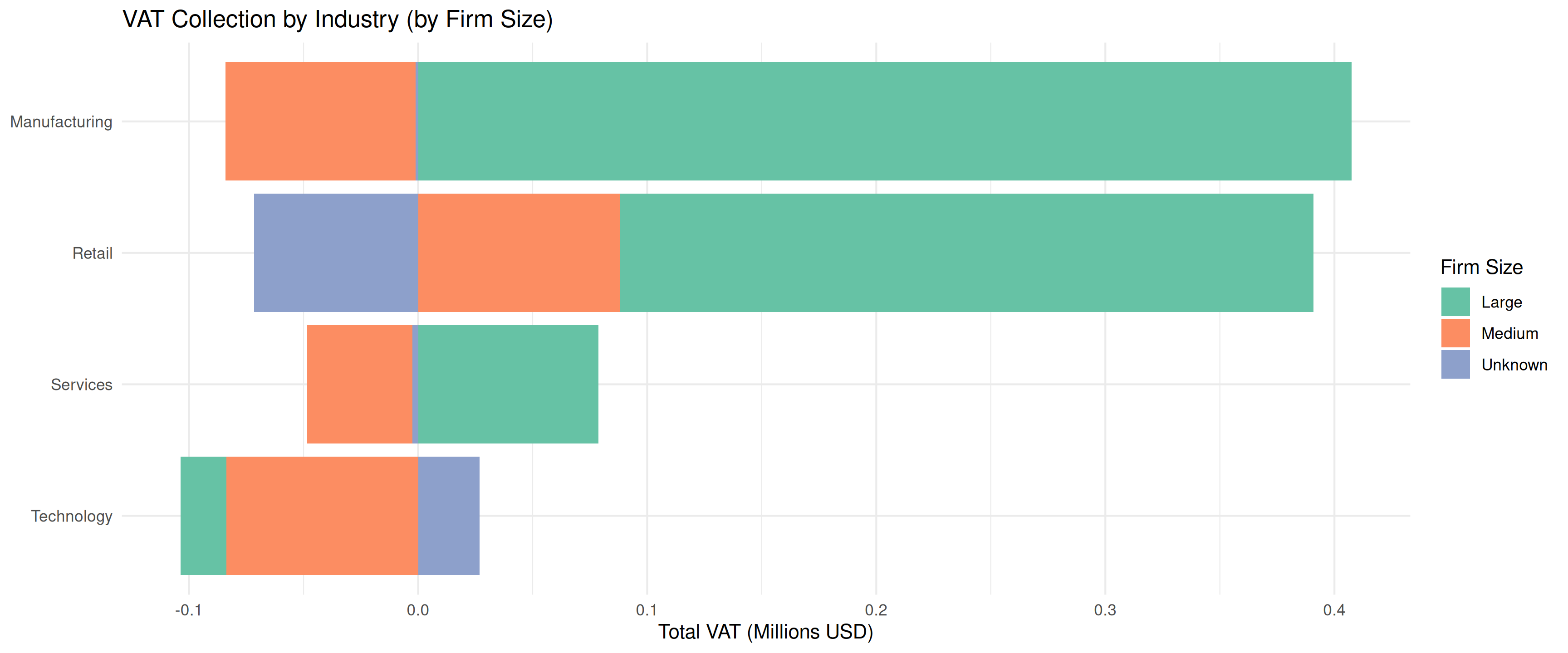actual_vat by industry AND firm_sizeindustry on x-axis, total_vat on y-axisfill = firm_size to color bars by firm sizeposition = "dodge" to make bars side-by-sidecoord_flip()theme_minimal()Question: Which combination (industry + firm size) collects the most VAT?