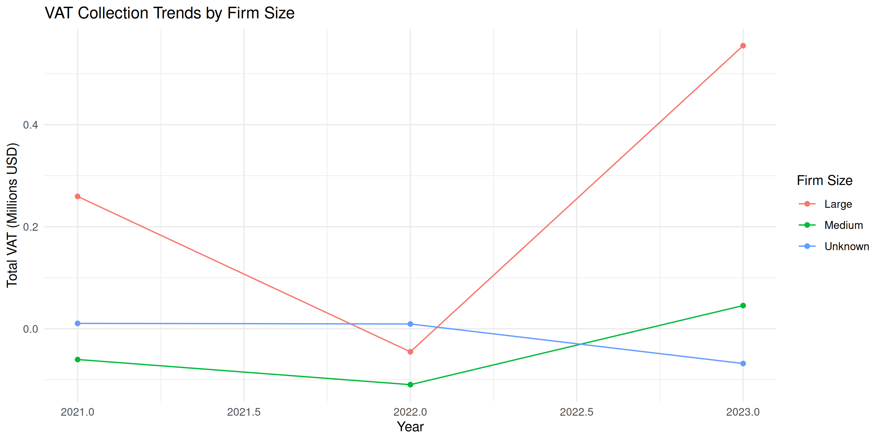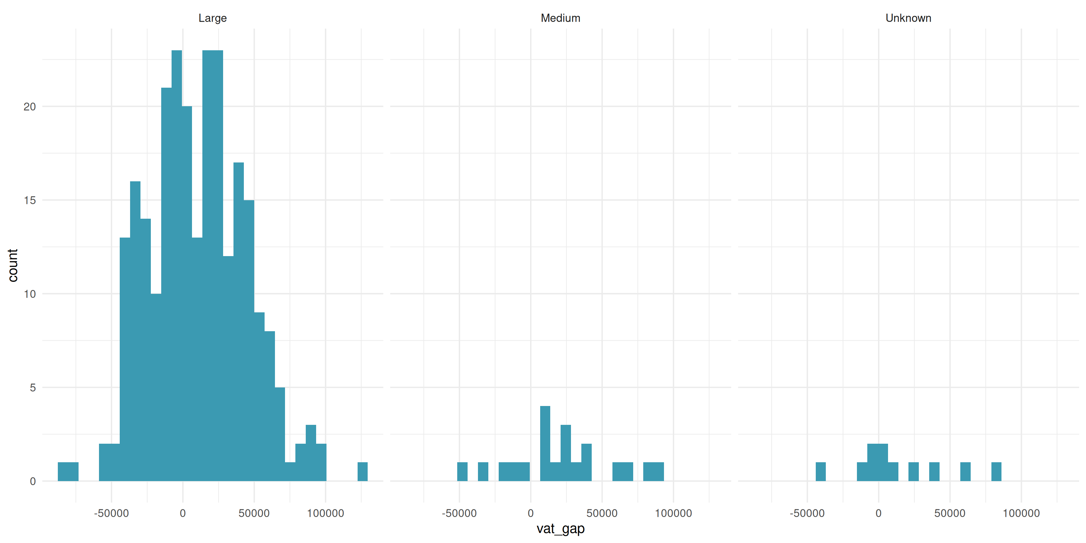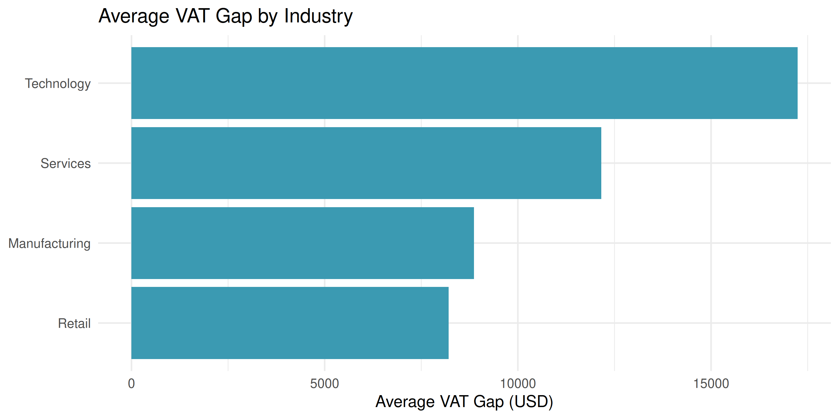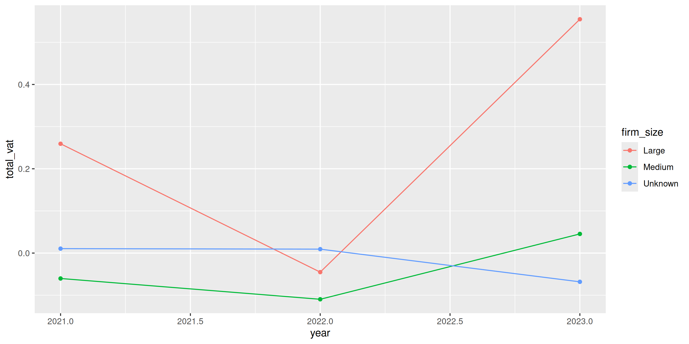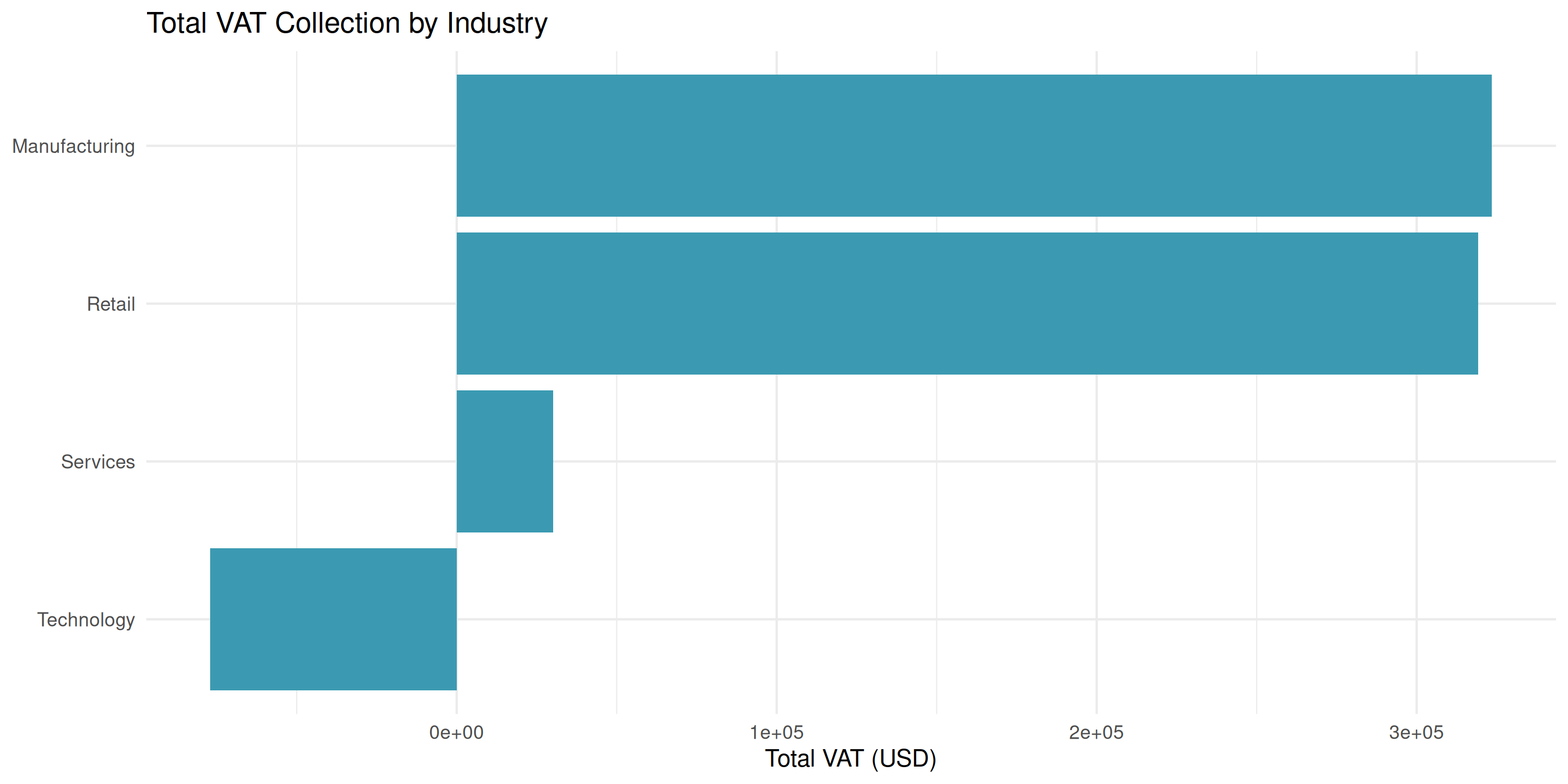 actual_vat by industry AND firm_sizeindustry on x-axis, total_vat on y-axisfill = firm_size to color bars by firm sizeposition = "dodge" to make bars side-by-sidecoord_flip()theme_minimal()Question: Which combination (industry + firm size) collects the most VAT?