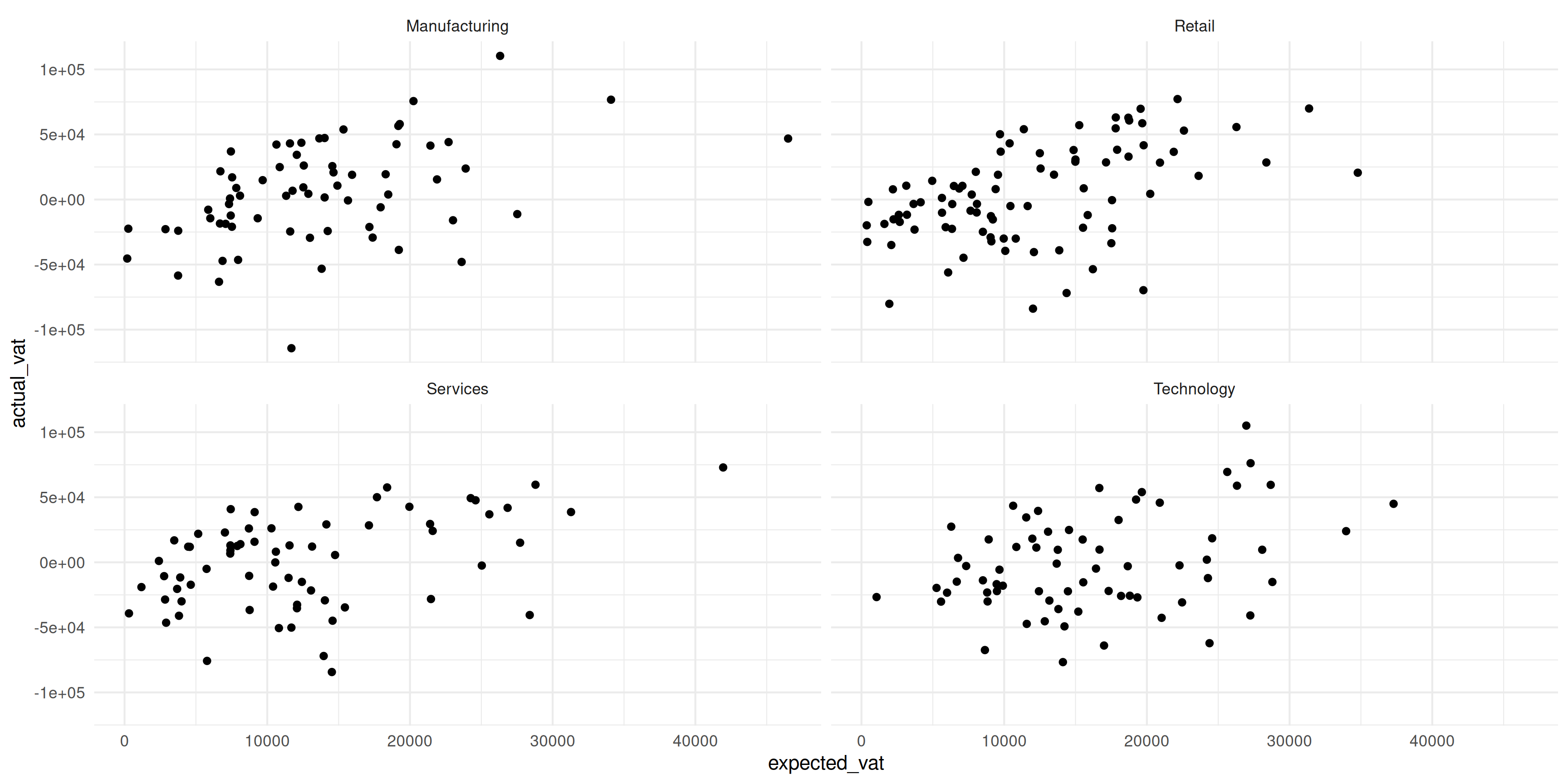 taxable_income vs actual_vatgeom_point()facet_wrap(~ industry)geom_smooth(method = "lm")Always include: