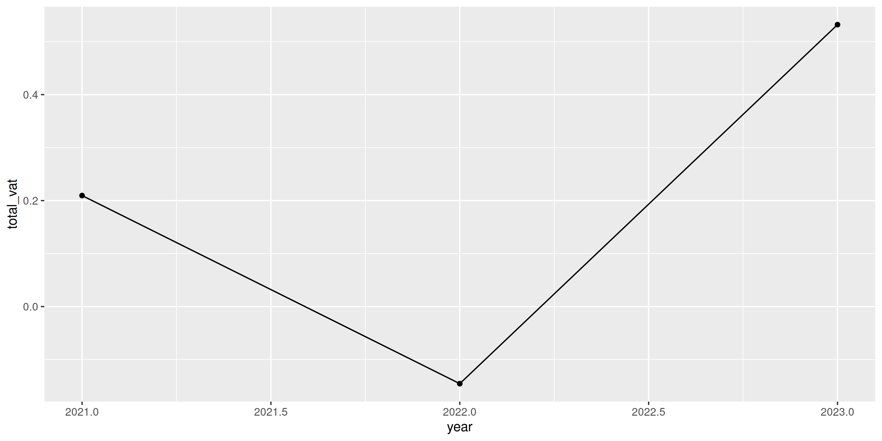vat_gap by yeargeom_line() and geom_point()year to x-axis, average gap to y-axistheme_minimal()Question: Is the VAT gap increasing or decreasing?